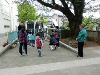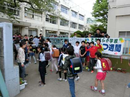 今日も、5年生と6年生が担任の先生や町会長さんと朝のあいさつの声かけ活動を行っていました。下級生とはハイタッチする微笑ましい姿と笑顔が印象的でした。