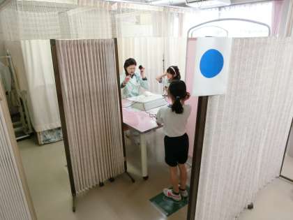 写真は、今日の3校時、2年1組の検査の様子です。検査の仕方について説明を受け、順序よく検査を受けていました。