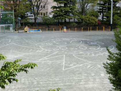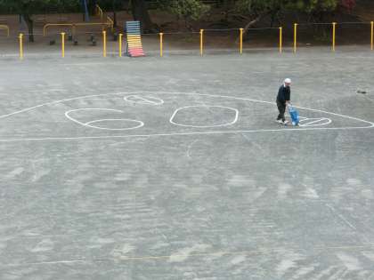 朝から天候に恵まれ、子どもたちの登校時間から、校庭で人文字を描くための設計とライン引きが、撮影を担当する業者の方によって始まりました。