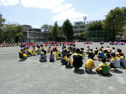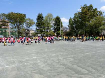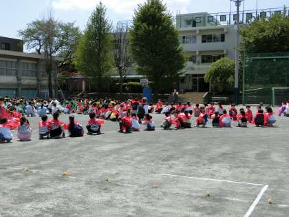 放送による指示で、子どもたちが学級ごとに順番に校庭に出てきました。