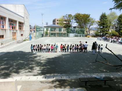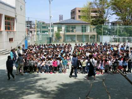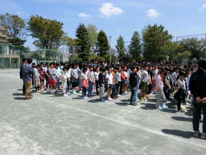 校庭に設計された台形の「わく」に、1年生から順に並び隊形づくりをしました。校舎3階に設置されたカメラに向かって立ち、撮影に臨みました。