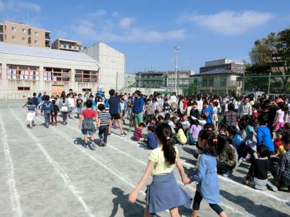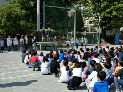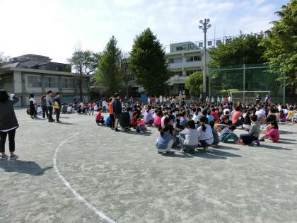 ペア学年でペアを組み、新しく着任した先生や主事さんについて紹介するクイズ形式の問題に答える集会でした。集会委員会のみなさんが出すクイズに、みんなで考え、みんなで動いて回答する楽しい集会になりました。
