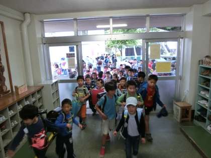 小雨が降る中、子どもたちは元気よく登校してきました。