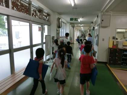 子どもたちが主体となり活動する異年齢集団活動“笹の子班”による笹の子タイムの第1回目が行われています。1年生にとっては初めての笹の子タイムです。全員が体育館で6年生のお兄さん・お姉さんのお迎えを待ち、各班の教室へ移動していました。