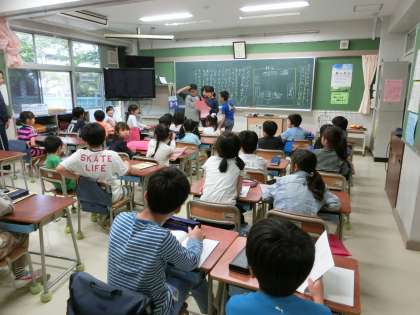 今日の活動に向け、リーダ役を務める6年生が準備を進めてきました。各班の教室で、自己紹介や簡単な室内ゲームを行っています。各教室からは歓声が響きわたっています。