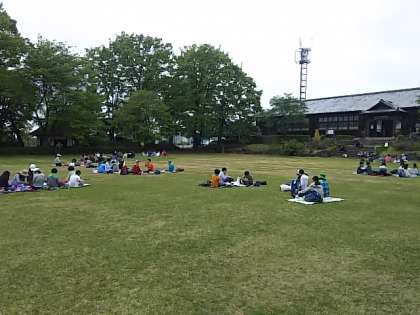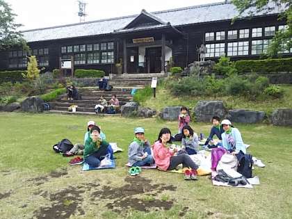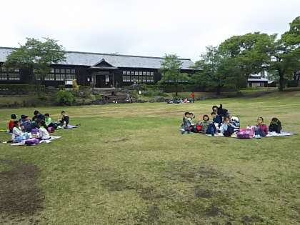 見学のあとは、待ちに待ったお弁当タイムです。行動班で仲よく食事の時間を楽しんでいます。が、小雨が降ってきたため、バスに移動して続きを食べています。