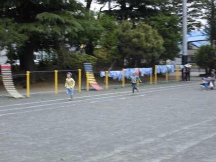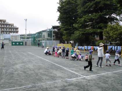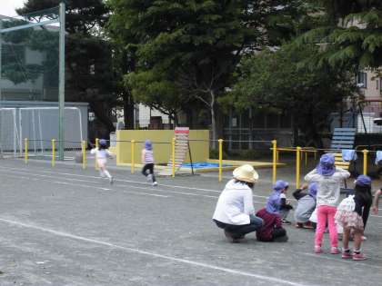 桜丘幼稚園の園児たちが、笹原小の校庭で走力測定をしています。
