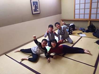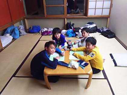 その後部屋に戻り、一日を振り返り、日記の記入中です。また、検温と健康観察をし、布団敷き、歯みがきなど、進めています