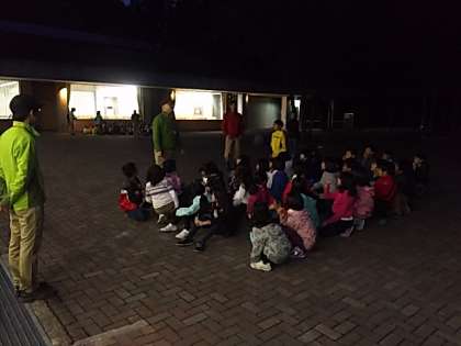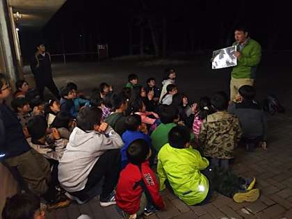 宿舎スタッフの方々の案内で、真っ暗な宿舎周辺を散策し、五感を使って普段生活する私達と、暗やみの中でも活動できる動物との比較などをし学習を深めました。
