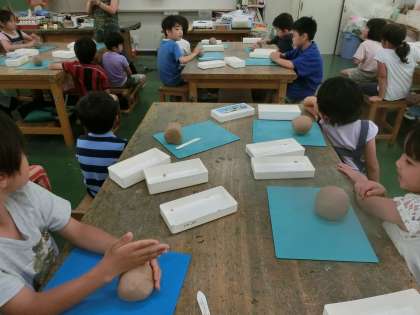 今日は、その第1時間です。今日の学習のめあてと学習活動の流れを確認したあと、ウォーミングアップとしての“粘土体操”を楽しみ、粘土を一つの塊にすることを楽しみました。