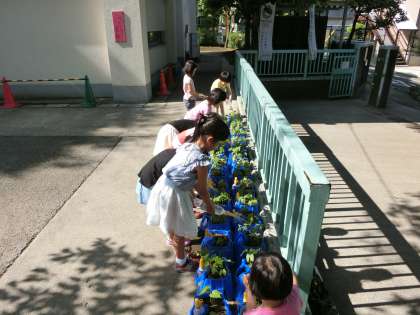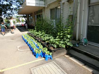 中庭では、1年生がアサガオへの水やりを行っていました。アサガオもグリーンカーテンの植物も、ずいぶん生長してきました。観察をしながら、一生懸命お世話をする子どもたちです。