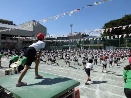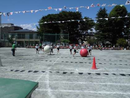 6年生によるキレのいいダンスの後は高学年リレー、そして全校児童による大玉送り。最後の種目は、終わりの体操です。
