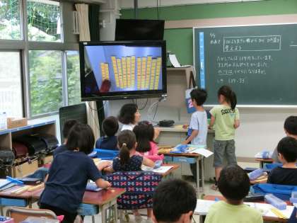 自分の考えを、ICT機器(実物投影機と大型テレビモニタ)を活用してみんなに説明したり、友達の考えを聞いたりしながら活動していました。また実際にブロックを使った算数的活動を通して、筆算と具体物を関連させ、解決につなげていました。