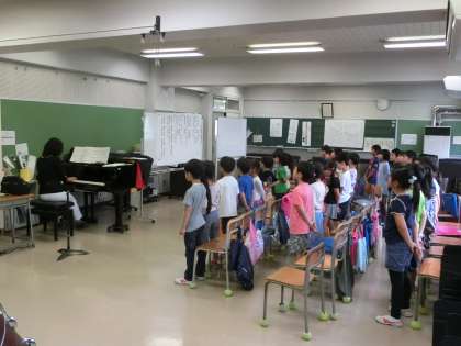 今日の4校時の音楽室では、2年2組が合唱曲“ともだちと”を楽しく歌ったり、鑑賞曲「トルコこうしんきょく」と「メヌエット」を聴き、2拍子や3拍子の曲想を感じ取りながら、学習に取り組んでいました。手拍子をしたり指揮をしたりしながら、感想を話し合い、楽しく聴いていました。