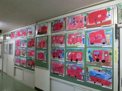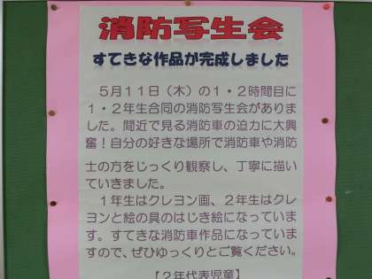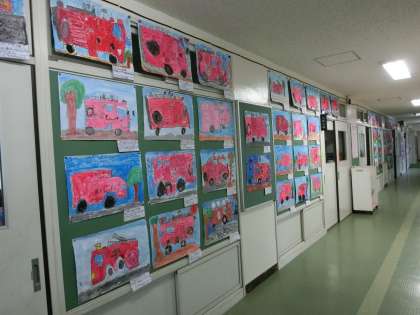 5月11日(木)の1・2校時に取り組んだ「消防写生会」の作品を、各学級の廊下掲示コーナーに展示しています。
