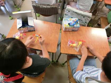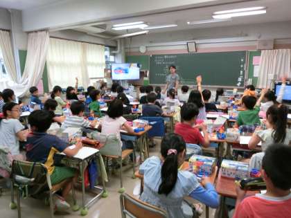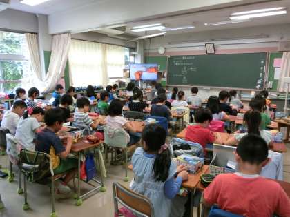 3年生の学習経験を生かし、モーターを回す回路を考え、回してみる学習です。豆電球と乾電池の関係からモーターと乾電池の関係を考え、回路をつくり、モーターの回転が分かるようにプロペラを付け、全員が確かめていました。回路のつくり方については、ICT機器(実物投影機と大型テレビモニタ)が効果的に活用されていました。