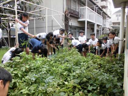6年生がじゃがいもを植えた畑に雑草が繁茂してきたため、本日草取りを行いました。