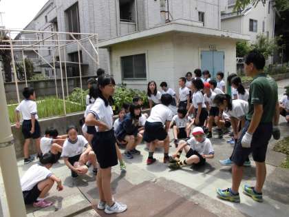 草を取った後のすっきりとした畑で、じゃがいもの成長と日当たりの関係をしっかり学習していました。