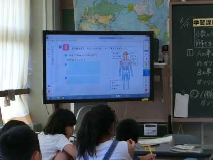 6年1組のグループでは、“小数と分数のいろいろな問題の解き方を考えよう”の学習課題で、身近な生活に関する問題の解決に取り組んでいました。ICT機器を使い全校に導入されているデジタル教科書を提示し、問題解決に取り組む工夫もありました。子どもたちも興味・関心をもち、意欲的に学習に取り組んでいました。
