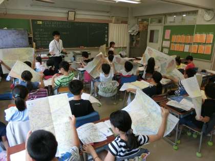 3年2組の今日の社会科の学習は、“世田谷区の商店は、どのようなところに多く集まっているのだろうか”というめあてで、一人ひとりが予想を立て、資料や地図を活用しながら調べ、みんなで話し合う学習を進めていました。