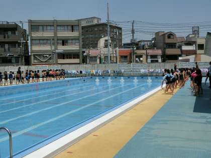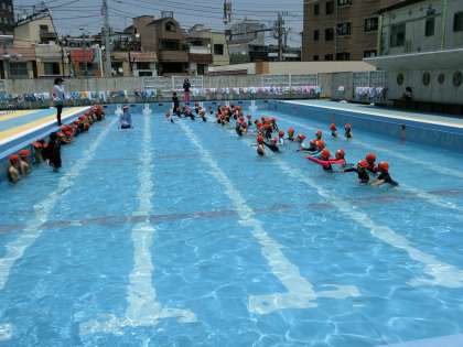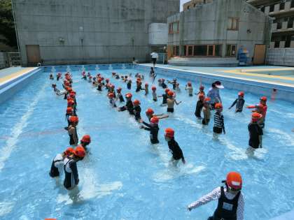 小学校生活で初めて学校のプールにみんなで入りました。準備運動を行い、注意することについて話を聞き、シャワーを浴び、人員確認を行い、プールに入水しました。
