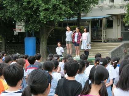 続いて6年生による「笹の子スピーチ」では、「夏至について」「ら抜き言葉について」「ドラえもんの道具とその進化」について、自分の考えをまとめ、今後の自分の取組についての主張もあり、大きな拍手を受けていました。