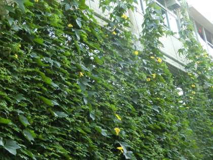 北校舎に設置されているグリーンカーテンも、2階から3階付近まで広がりを見せ、所々に黄色い花が咲いているのが見られます。グリーンカーテンは、エコと温暖化対策として設置されていますが、強い直射日光を遮り植物を通して広がる涼しい空気が、グリーンカーテンの内側の教室では感じられます。