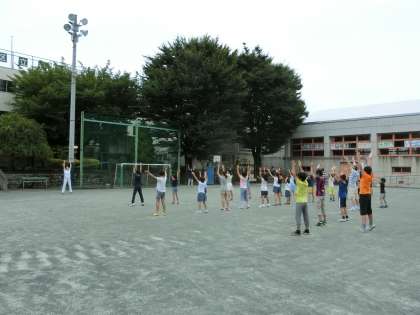 子どもたちが校庭に集まる頃には雨が上がり、みんなで放送に合わせて全身をいっぱい動かし、気持ちのよい朝を迎えることができました。参加スタンプを押してもらっている子どもたちからは笑顔が見られ、互いに“おはようございます!”と元気なあいさつが交わされていました。