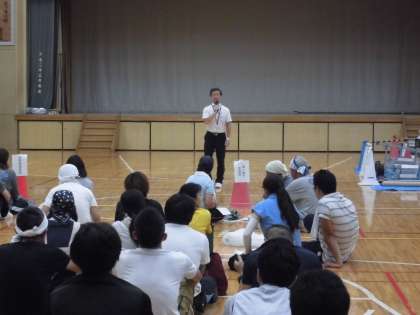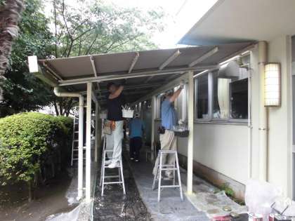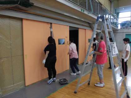 世田谷区内の各学校から主事の皆様が集まり、笹原小学校を会場として研修会が開かれました。雨でプログラムの変更もありましたが、塗装、木工、剪定などのグループに分かれて取り組んでいました。この研修は、明日も実施されます。