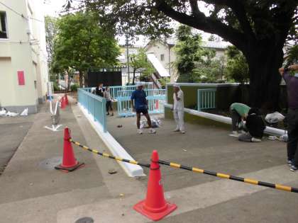 昨日に引き続き、本日も研修が実施されました。本日は、正門周辺の塗装のために、迂回をしていただくなどご不便をおかけいたしました。お陰様で研修の成果の一つとして、正門周辺をきれいに塗り替えることができました。