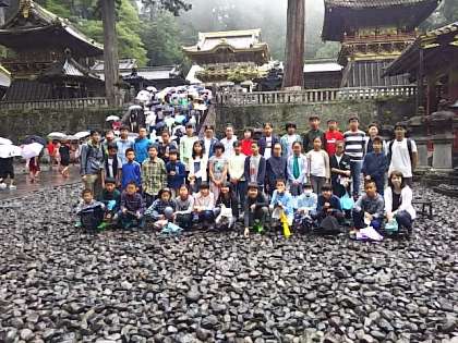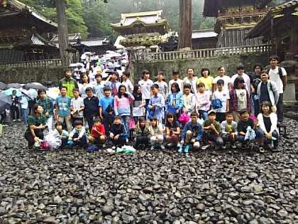 雨が小降りとなりました。改修工事が終わった陽明門をバックに集合写真撮影をしました。
