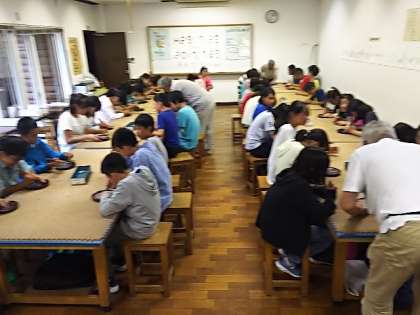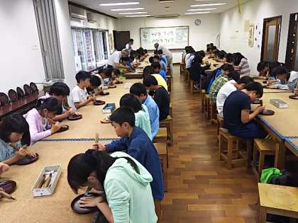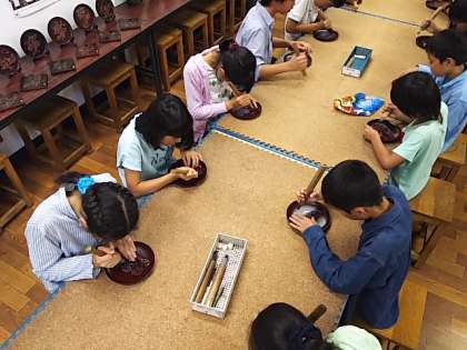 握っているひっかき刀の反対の指をひっかき刀の先に当て、彫る向きを考えながら、おぼんを回転させて、製作活動に集中して取り組んでいます。午後2時現在、活動進行中です。