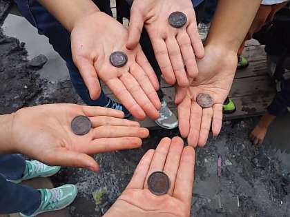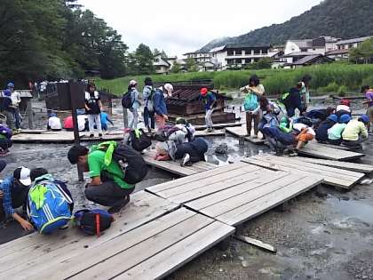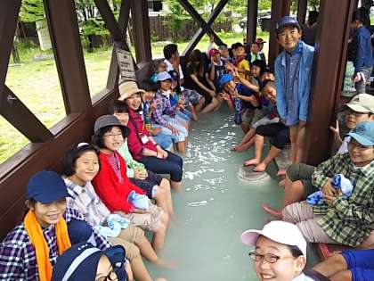 足湯に入り、源泉で10円玉の変色実験をしたり、楽しんでいます。今、1組が源泉、2組が足湯です。