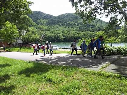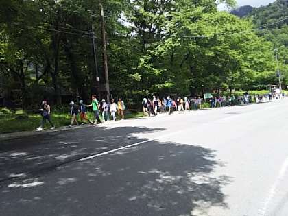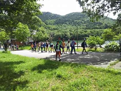 晴天の中、いよいよハイキングが始まりました。湯ノ湖畔を歩くコースに入りました。