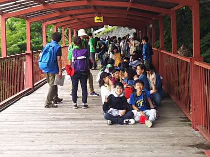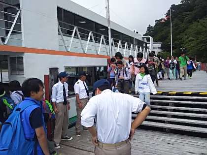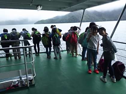 菖蒲が浜から、2時50分発の中禅寺湖汽船(遊覧船)に乗船しました。遠くは霧がかかっていますが、デッキに出ている子どもたちは、心地よい風に吹かれながら船旅を楽しんでいます。