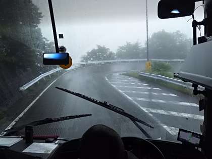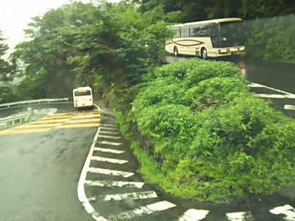 中禅寺湖の船旅を終え、歌ケ浜に着きました。汽船から降りると雨が降っていました。3時28分、バスで立木観音駐車場を出発。現在、第1いろは坂を下っています。