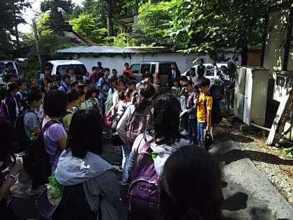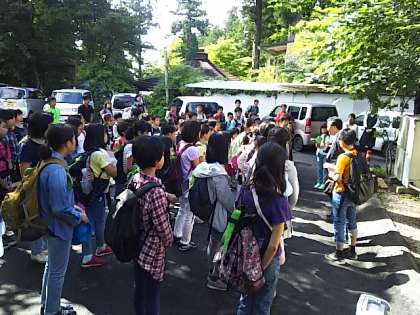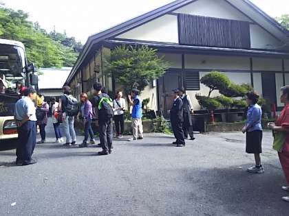 宿舎玄関前で閉園式を行いました。3日間お世話になった日光東観荘のみなさんへ感謝の気持ちを伝え、見送りを受け、予定通り8時に20分出発しました。