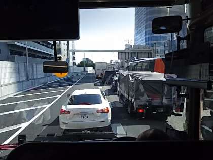 3時45分現在、首都高速道路4号線新宿を通過しました。高井戸から環八経由で学校へ向かいます。途中渋滞のため、学校での解散は4時半前頃になりそうです。
