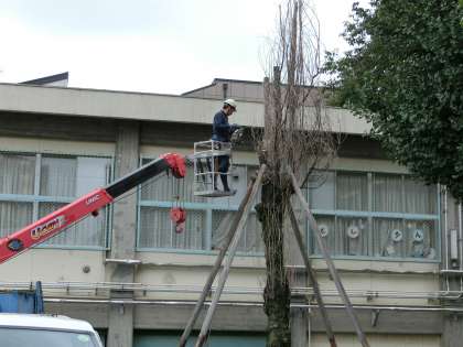 長年子どもたちの成長を見守ってくれた、図書館前のポプラの木の伐採作業が、造園業者により朝から進められています。