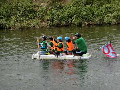 夏休みを中心にいかだを制作し、浮揚試験等を行い、当日を迎えました。天候にも恵まれ、それぞれの艇に子どもたち4名と大人1名が乗り、スタートからゴールをめざし、多摩川の流れに乗って進みました。地上からの声援もたくさん受けながら、「初出場」とは思えないほどの健闘ぶりでした。
