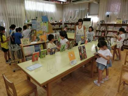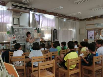 今日の午後、図書館司書の方による“夏のこわいおはなし会”が図書館で開かれました。薄暗くセットされた図書館で、紙芝居や絵本などの読み聞かせをしていただき、参加した子どもたちは真剣に聴き入っていました。
