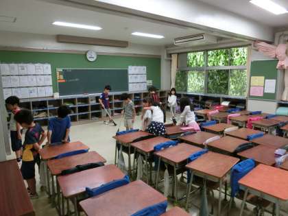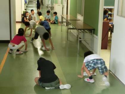夏休み中に学校主事さん方が、廊下や階段・トイレなどのワックスがけを行い、また、学校主事専門研修会場として正門周辺や体育館入口周辺、学校図書館への渡り廊下などの塗装を行い、ピカピカになった校舎内です。子どもたちは、気持ちよく教室での学習や生活ができるように丁寧に掃除をし、教室もきれいになりました。
