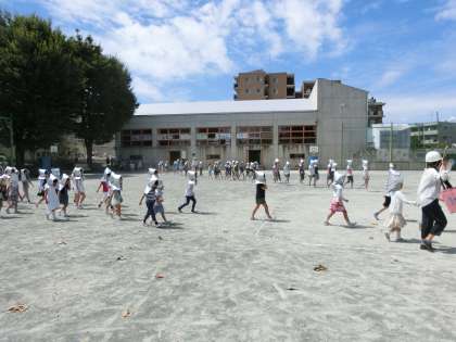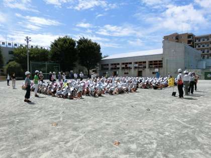 子どもたちは、放送や担任の指示を聞き、避難時の約束「お・か・し・も」を守り、静かに落ち着いて校庭に避難しました。