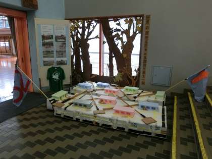 先日、おやじの会のみなさんが中心となって作ったいかだで出場した“アドベンチャーin多摩川”の様子を伝えるコーナーを、体育館入口コーナーに設けました。2艇のいかだ、旗、みんな着たTシャツ、そして写真などを展示しています。