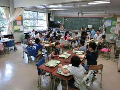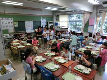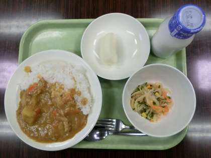 今日の献立は、「カレーライス・大根サラダ・りんご・牛乳」です。子どもたちに人気のカレーライスに、笑顔もいっぱいです。また、久しぶりの給食の時間に、友達との会話も弾み、お代わりをする姿も見られます。たくさん食べて健康なからだをつくりましょう。