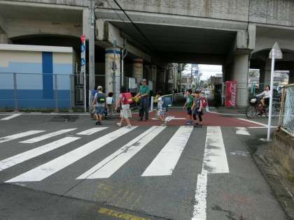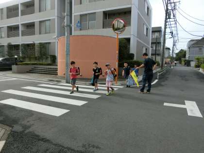 朝の登校時間、学校主事さんが安全確保と安全指導のための旗振りをしているところの様子です。学校へ向かって登校する子どもたちから主事さんに「おはようございます!」と元気なあいあつが届けられていました。主事さんも子どもたちに負けないように、「おはようございます!」と一人ひとりに声をかけていました。