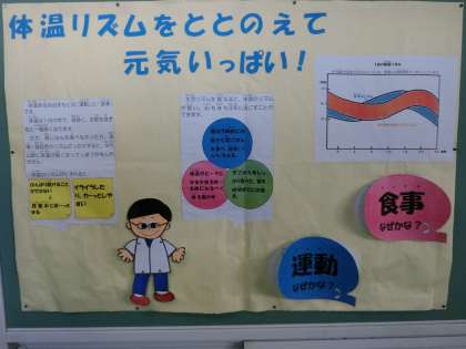 保健だより9月号でもお知らせしていますが、規則正しい生活を送るために、“体温リズムをととのえて、元気いいぱい!”の資料を掲示しています。