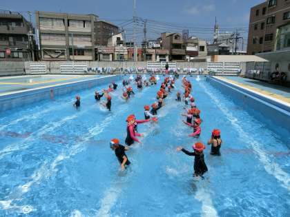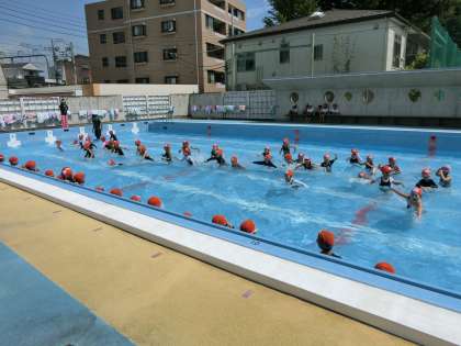 曇りがちだった天候も見事に日差しが戻り、水泳学習に適した気温と水温となる中、元気いっぱい、水の中を移動したり、もぐったり、浮いたりする遊びを行っていました。