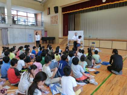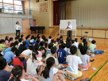 4年生は、1学期から引き続き、キッズタイム(総合的な学習の時間)で「ハッピープロジェクト(みんなが幸せになるために)」の学習を進めています。本校には弱視通級指導学級「目の教室」があることから、1学期には、見えにくい人の勉強や生活について話を聞いたり、体験したり、調べたりして、発表会も開きました。