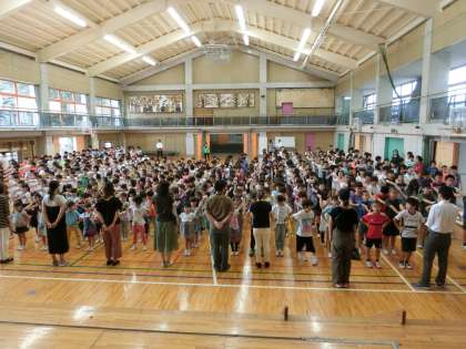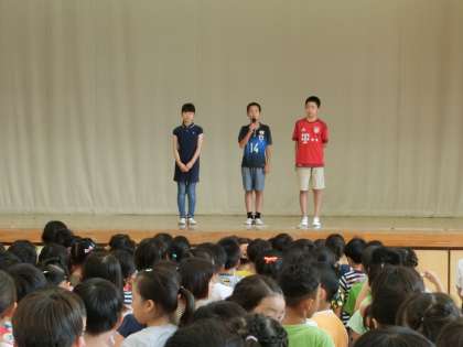 今日の児童朝会は体育館で行いました。